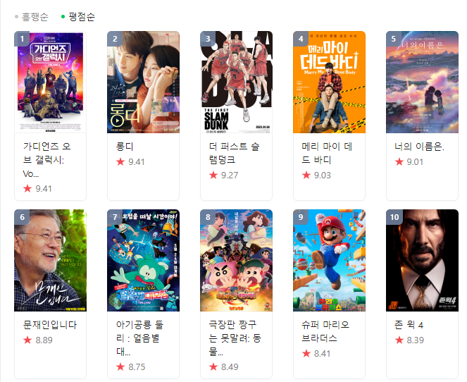1위 가디언즈 오브 갤럭시 : volume 3 2023.05.03개봉 9.41 ★★★★★
